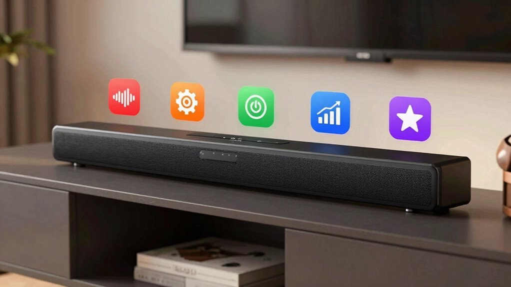 When choosing a soundbar, focus on five key specs that really matter. First, consider the type—active or passive. Next, check audio specs like bass response and frequency range for sound quality. Make sure you have the right connectivity options, like HDMI ARC and Bluetooth, for easy pairing. Size and design should fit your space without overwhelming or underwhelming it. Finally, additional features like voice enhancement can elevate your audio. There’s more to learn about maximizing your soundbar experience!