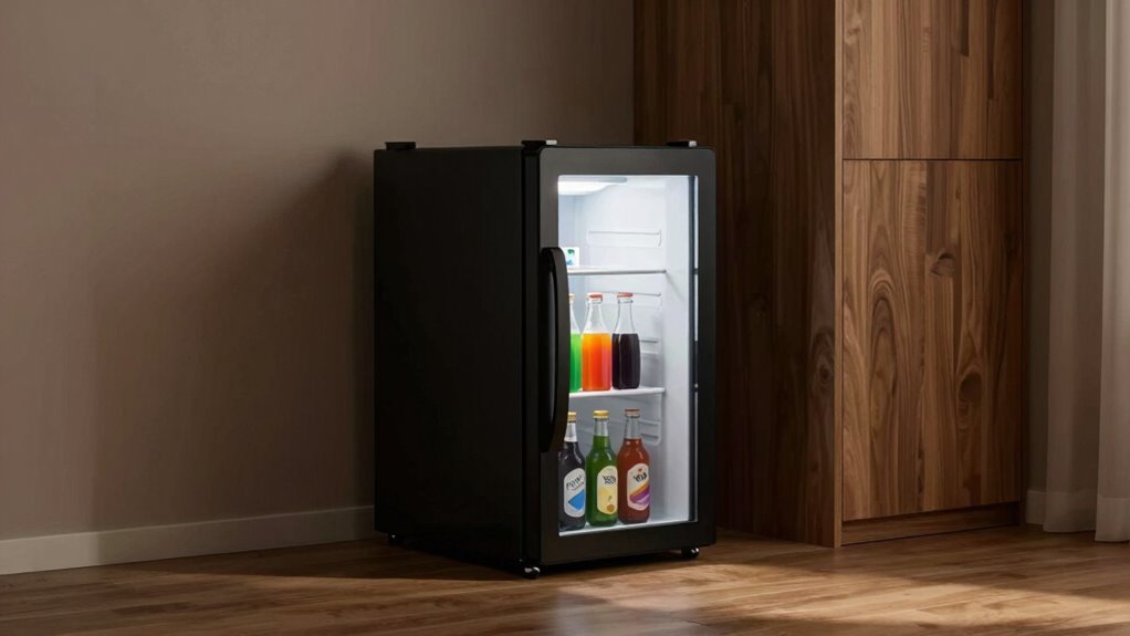 To guarantee your mini fridge operates quietly, it’s essential to choose the right location in your space. Start by avoiding corners and enclosed spaces, as these can trap sound and heat, leading to increased noise. Make sure there’s adequate ventilation around the fridge; this helps it run efficiently and minimizes noise. Regular mini fridge maintenance also plays a role in noise reductionโclean the condenser coils and check for any debris that might hinder airflow. Position your fridge on a level surface to prevent vibrations that can amplify noise. Finally, consider using anti-vibration pads under the fridge legs to absorb any unwanted sounds. With these tips, you’ll enjoy a quieter environment while keeping your food and drinks cool.