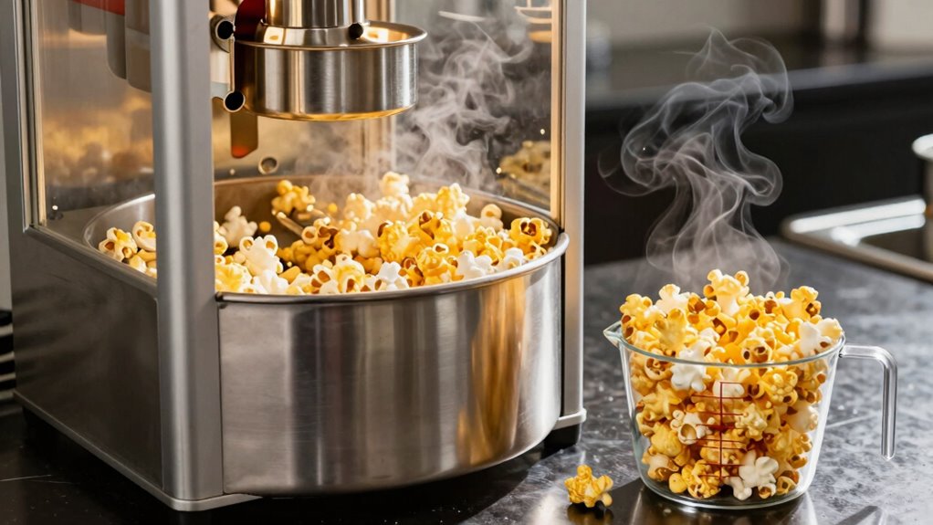 To measure popcorn production effectively, you need to contemplate the size of your kettle, as it directly impacts how much popcorn you can produce. You’ll also want to track the actual yield per batch to determine your efficiency. By understanding these factors, you can optimize your popcorn-making process.