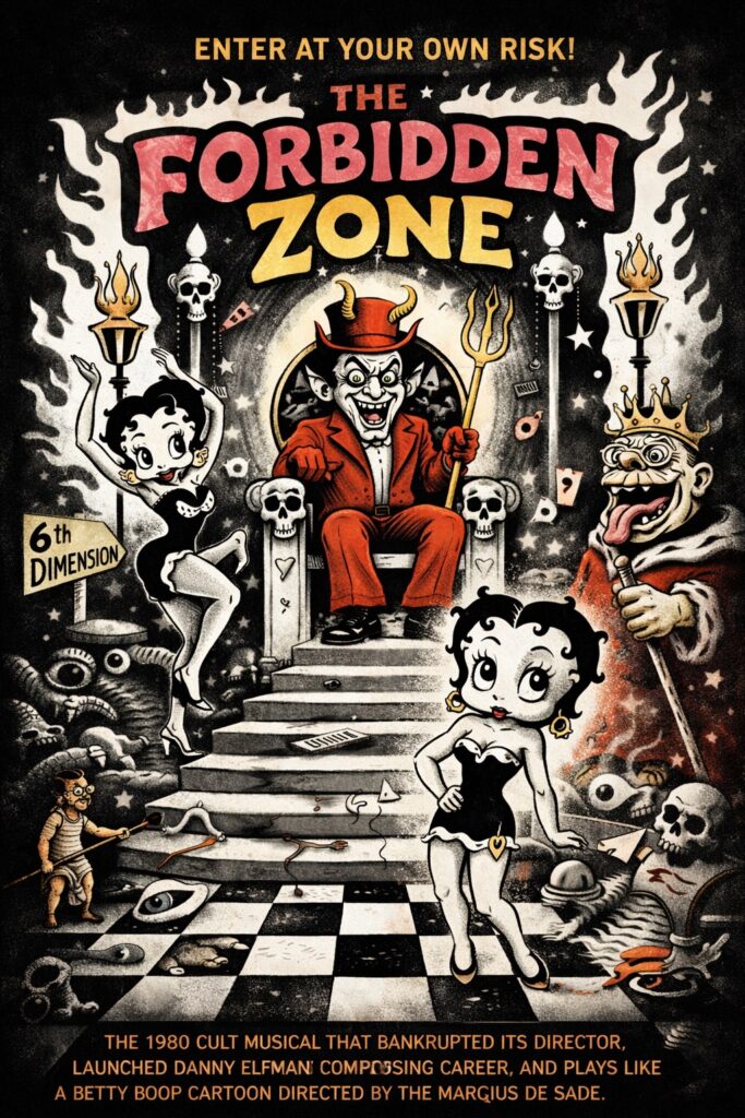 Describing the experience of watching The Forbidden Zone is genuinely difficult. The Criterion Collection hasn’t touched it (yet), the BFI hasn’t run a retrospective, and mainstream critics have largely ignored it. The audience for this film has always been self-selecting: people who see the phrase “Danny Elfman plays Satan in an underground musical about a portal to the Sixth Dimension” and feel their pupils dilate rather than their brow furrow.