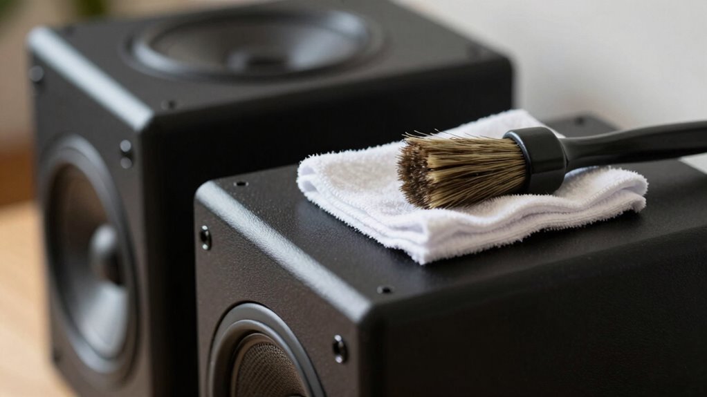 You should clean your speakers at least once a month to keep them in top shape. Imagine the dust settling on your beloved sound system, muffling those crisp highs and deep lows. Regular speaker maintenance not only enhances audio quality but also extends their lifespan. If you notice visible dust or debris, don’t hesitate to clean them more frequently. A little attention goes a long way in preserving your speakers’ performance!