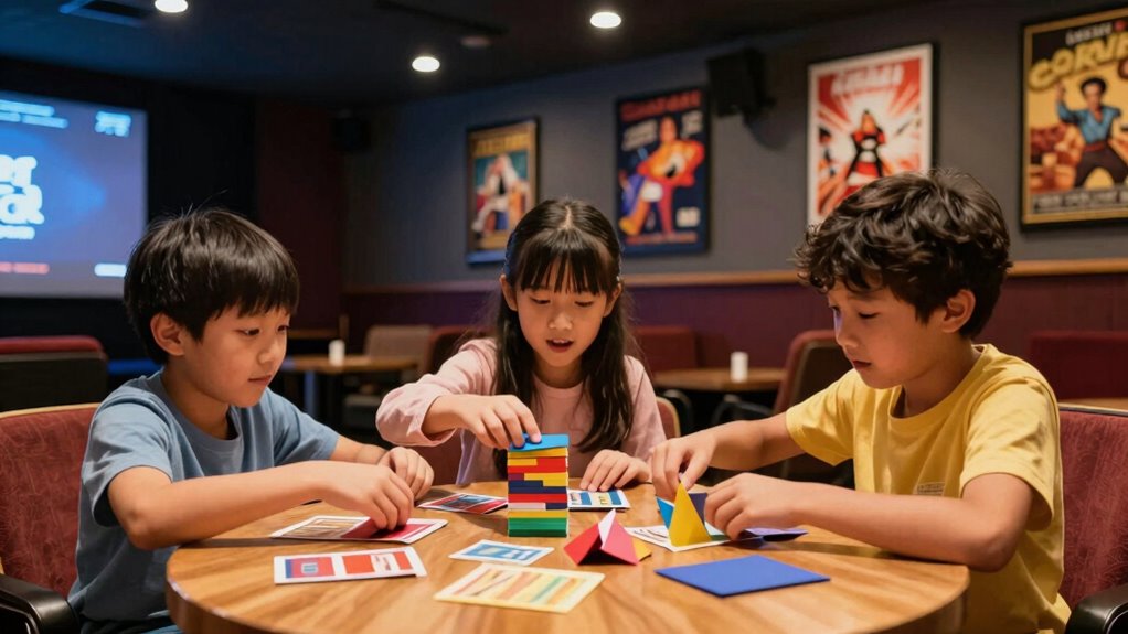 Storytelling and imagination games are powerful tools to ignite your child’s creativity and keep them entertained before a movie. You can encourage them to create their own stories or act out scenes with puppet shows, which are perfect for sparking imagination. Dress-up play is another great activity, allowing kids to become characters and invent new adventures. These activities foster storytelling skills and help children develop confidence as they bring their ideas to life. You might set up a simple puppet theater or provide costumes and props to inspire their creativity. Engaging in these games not only keeps kids busy but also builds their narrative abilities and expressive skills. Incorporating visual cues can further enhance their understanding and engagement during storytelling. Additionally, introducing imaginative play techniques can help expand their creative thinking and problem-solving abilities. Using age-appropriate materials ensures that activities are safe and enjoyable for children of different ages. With a little imagination, the waiting time becomes an exciting part of the movie experience.