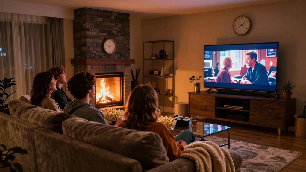 If you want everyone to stay awake, timing is key. Did you know that your alertness peaks in the late morning and early evening? Scheduling movie nights during these times boosts energy and keeps everyone engaged. Avoid late-night screenings or long films that can tire viewers out. By choosing the right moment, you’ll transform a sleepy movie night into an energetic, memorable experience—so everyone leaves feeling entertained, not drowsy.