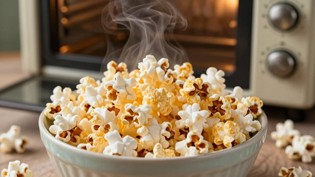 Before you start reviving your stale popcorn, preheating your oven is essential for achieving that perfect crunch. Setting your oven to the right temperature guarantees the popcorn’s texture transforms from chewy to crispy. Aim for around 250°F (120°C) for ideal results. A gentle warmth envelops each kernel. The aroma of fresh popcorn fills your kitchen. Crispy bites await as you prepare to indulge. The oven works its magic, restoring lost crunch. Each handful will be a delightful treat. Proper oven temperature is crucial for evenly re-crisping your popcorn without burning it. Taking these steps will revive your popcorn and elevate your snacking experience. So, preheat that oven and get ready to enjoy your once-stale popcorn in a whole new light!