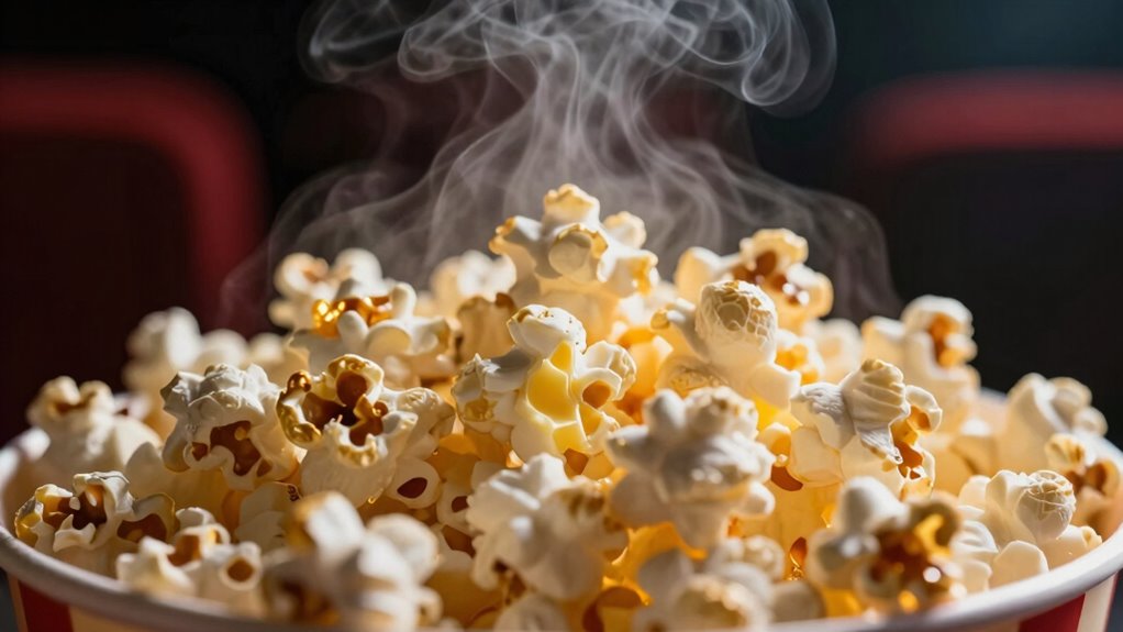 The enchanting aroma of freshly popped popcorn isn’t just about the individual volatile compounds; it’s also about how they interact with your senses. Freshness factors play a significant role here. When popcorn is newly popped, the heat releases a wave of aromatic compounds, creating an irresistible scent that triggers your appetite. As the popcorn cools, these compounds begin to dissipate, leading to a decline in flavor evolution. You might notice that the vibrant, buttery aroma fades, making that first bite of fresh popcorn an experience like no other. This immediate burst of flavor and aroma activates your taste buds, enhancing your overall enjoyment. So, when you indulge in fresh popcorn, you’re not just savoring a snack—you’re experiencing a delightful sensory journey.