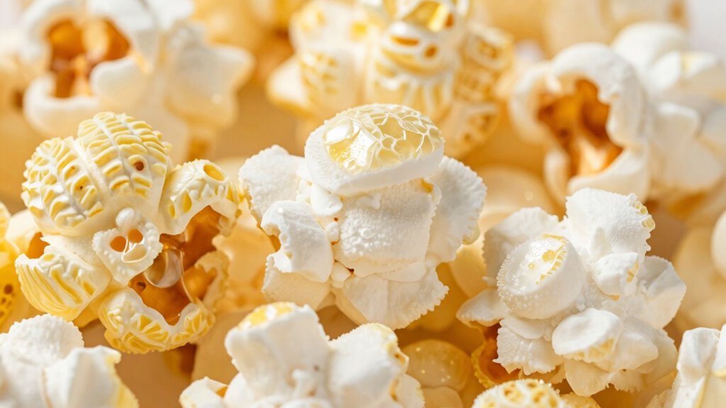 The strength of the kernel’s outer shell and its starch composition play significant roles in determining popcorn’s fluffiness. A shell that’s too thick or tough can trap steam, preventing the kernel from expanding fully and producing light, airy popcorn. Meanwhile, the starch composition inside affects how well the popcorn puffs. Ideal starch transforms into a gel that expands smoothly, creating fluffy textures. Additionally, sound vibrations from certain frequencies have been studied for their potential to influence cellular behaviors, which could someday be related to popcorn expansion processes. Understanding the resilience of the shell can further improve popcorn quality by optimizing popping conditions.