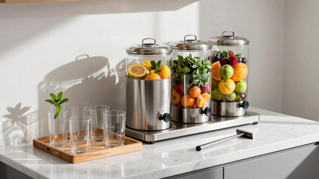 While hosting a gathering, the last thing you want is a spill ruining the fun. That’s where spill-proof drink dispensers come into play. Look for innovative designs that keep your drinks safe from accidental spills. Dispensers made from spill-proof materials like silicone or BPA-free plastic are perfect for outdoor events or lively indoor parties. They often feature easy-pour spouts or no-drip taps, ensuring your guests can serve themselves without creating a mess. Consider using jars with secure lids or pitchers with locking mechanisms for added security. Additionally, choosing dispenser construction features for your dispensers can help keep your drinks fresh and free from debris. Opting for spill-resistant designs can further reduce messes and make cleaning easier. Incorporating durable materials can also extend the lifespan of your drink station accessories. For added durability, selecting weather-resistant dispensers can ensure your drink station stays in top condition during outdoor gatherings. By choosing the right dispensers, you’ll not only elevate your drink station but also minimize clean-up, letting you focus on enjoying the moment with your friends and family.