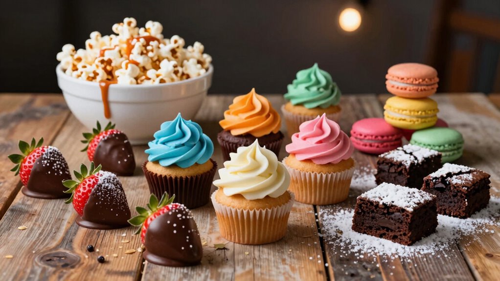 For a fun movie night, try popcorn desserts drizzled with chocolate or caramel, or mix sweet & salty snack mixes with pretzels and chocolate-covered almonds. You can whip up quick no-bake cookies in minutes or enjoy chocolate-covered strawberries and pretzels. Don’t forget bite-sized brownies and fruity dessert skewers for easy snacking! Creative ice cream cones and mini dessert cups offer big flavors without the mess. Stick around, and you’ll find even more delightful options to elevate your movie experience!