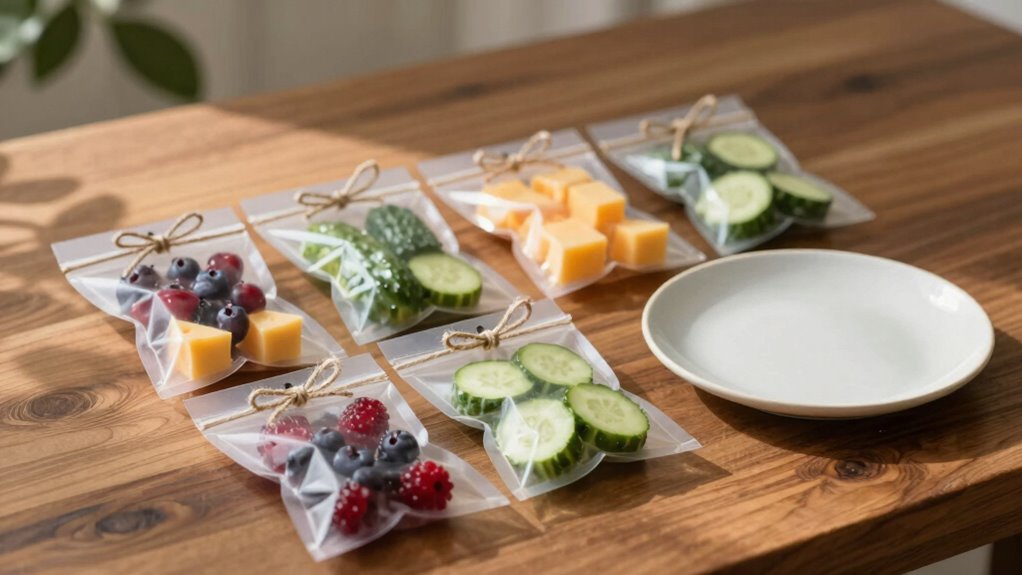 Since presentation can elevate even the simplest snack packs, think outside the box when showcasing your treats. Use creative presentation techniques to enhance snack aesthetics and make your packs more inviting. Here are some fun ways to present your snack packs: