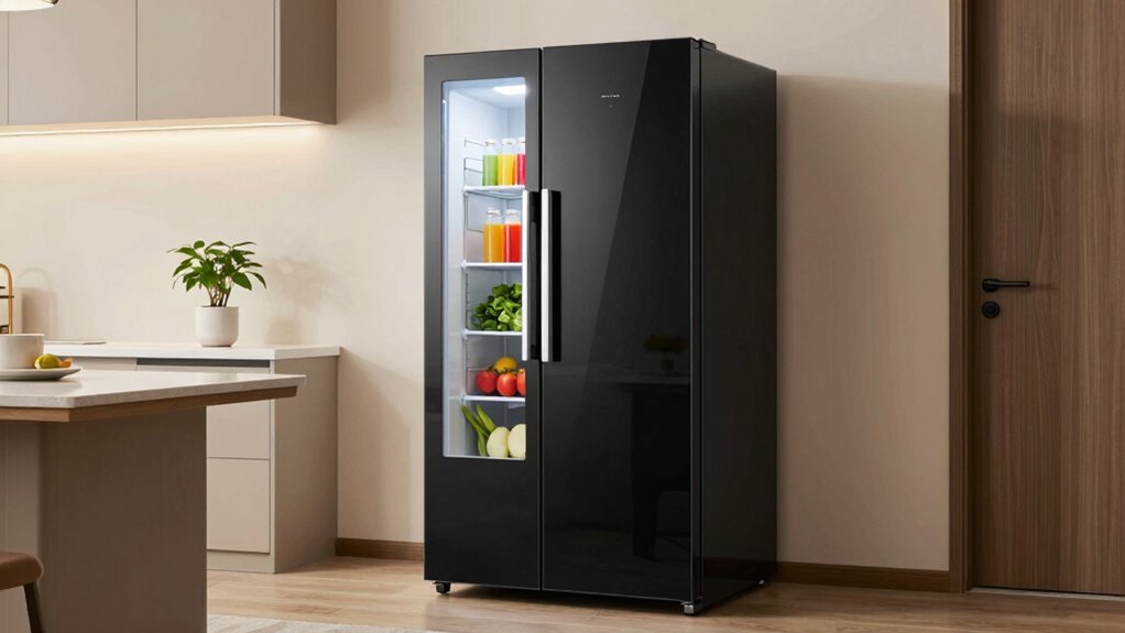 Since the design of a compact refrigerator directly impacts your apartment’s overall look, it’s essential to select a style that complements your space. Whether you prefer a retro vibe, a modern touch, or a sleek finish, there are options like chrome trim, stainless steel surfaces, or minimalist handles to match your decor. Reversible doors add flexibility, allowing you to place the fridge wherever it fits best. The exterior size and shape should be proportionate to your available space, typically ranging from 16 to 24 inches in width. A visually appealing design isn’t just about looks; features like interior lighting, adjustable shelves, and transparent drawers enhance both form and function, making your fridge a seamless part of your apartment’s aesthetic.