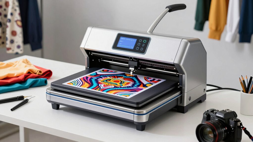 Safety and auto features are essential considerations that can greatly enhance the ease and security of using a heat press machine. Auto shut-off functions activate after about 15 minutes of inactivity, reducing the risk of overheating or fires. Automatic pressure adjustment guarantees consistent transfers and minimizes manual errors, making operation smoother. Hands-free auto release features allow the press to open automatically, keeping users safe from hot surfaces. Effective safety mechanisms like multilayer heat insulation and advanced cooling technology dissipate heat efficiently, preventing burns. Digital control panels with precise temperature and time settings also help reduce user errors, ensuring safer and more reliable operation. These features not only improve safety but also make the process more efficient and user-friendly.