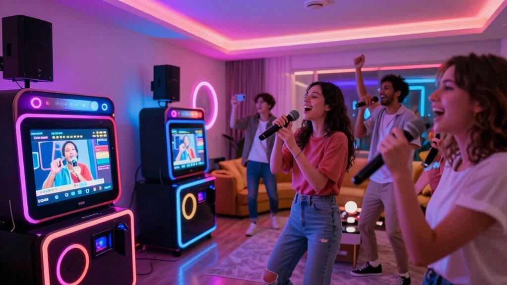 You might worry about compatibility, but connecting karaoke machines to smart home devices is pretty straightforward. I simply use Bluetooth or Wi-Fi, depending on the device, to pair my karaoke machine with my smart speaker or hub. Many models have dedicated apps that make setup easy, so you can control volume, lighting, and even song selection remotely. It’s a game-changer for seamless, hands-free party control.