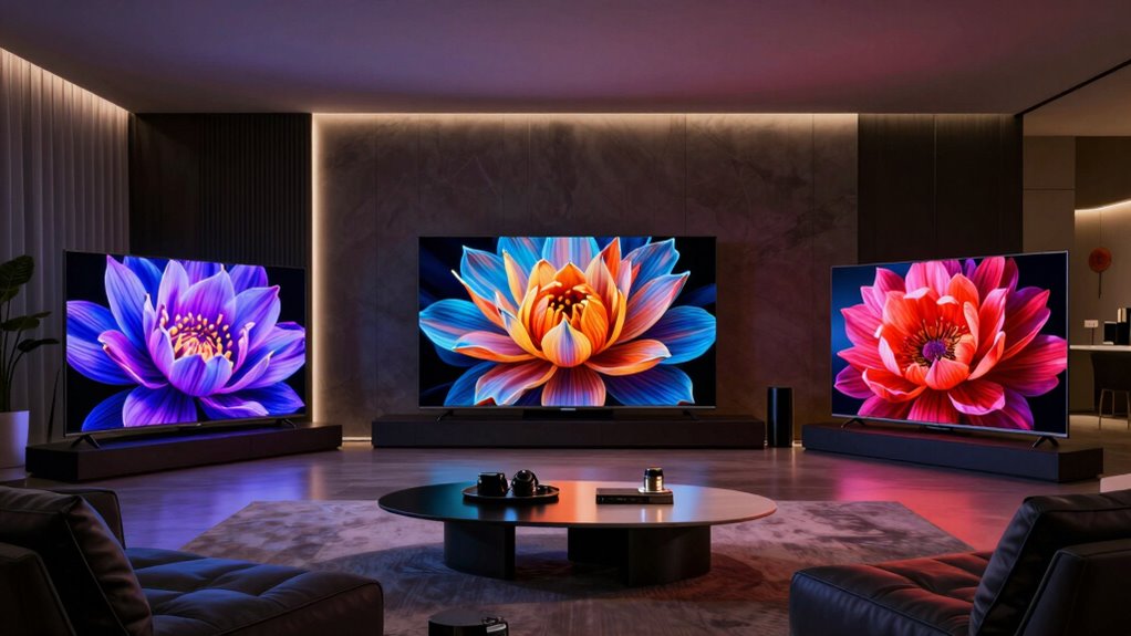 Ever wondered how much sound quality impacts your home theater experience? It’s huge. High-quality OLED TVs now support Dolby Atmos and DTS:X, delivering multidimensional, immersive sound that makes you feel like you’re in the middle of the action. Built-in speakers often include virtual surround sound tech, enhancing audio depth without needing external gear. AI-driven audio processing also plays a big role, sharpening dialogue, improving clarity, and balancing sounds in real-time. Features like virtual 3D surround or upward-firing speakers create a more cinematic atmosphere. However, for the best experience, pairing your OLED TV with a dedicated sound system or soundbar can make a noticeable difference. Sound quality isn’t just an add-on; it’s essential for truly immersive home theater viewing.
