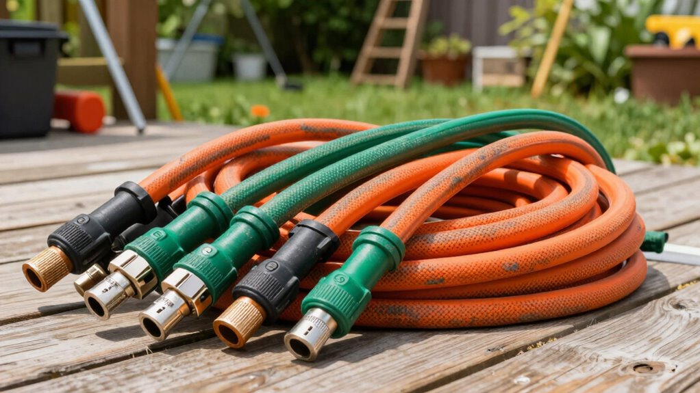 To guarantee outdoor extension cords are weather-resistant, I always look for cords labeled specifically for outdoor use. I check for heavy-duty insulation and a reputable waterproof jacket. I also avoid damage by inspecting cords regularly and keeping connections off the ground. Using weatherproof covers and unplugging cords when not in use helps prevent moisture from seeping in, keeping my equipment safe and functioning reliably regardless of weather conditions.