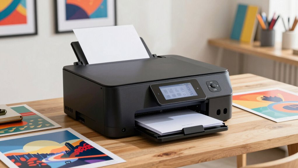 Media versatility is a crucial factor when selecting a photo printer for posters because it determines how well the printer can handle different paper types, finishes, and sizes. A versatile printer supports various media like glossy, matte, canvas, and specialty papers, giving you creative flexibility. It should also be capable of printing on a wide range of sizes, from small photos to large posters over 24 inches. Printers with adjustable input trays and multiple media feeds make switching media seamless, improving workflow. Compatibility with specialty media such as textured papers, cardstock, or transparent films opens up unique printing options for displays and artistic projects. Additionally, support for custom sizes and automatic media detection guarantees consistent quality and precise alignment across different media types.
