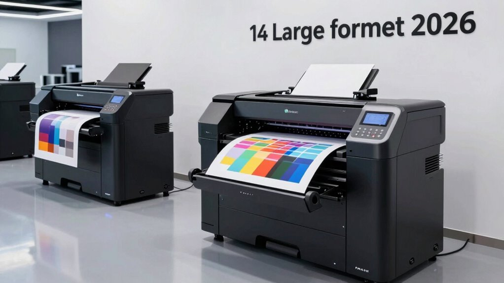 If you’re looking for the 14 best large format poster printers for 2026, I suggest checking out models like the Epson SureColor T2170, Canon PRO-2100, and HP DesignJet T650, among others. These printers offer high-resolution output, versatile media support, and efficient print speeds suitable for professional needs. They also excel in connectivity and eco-friendly features. Stay tuned, because I’ll share details to help you choose the perfect fit for your projects.