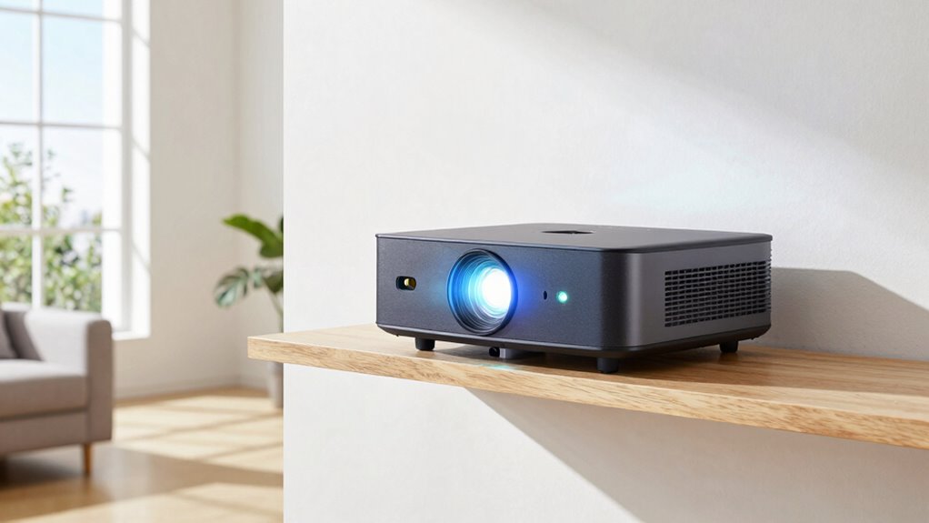 Choosing a projector for bright rooms requires careful attention to ambient light compatibility, as this factor directly impacts image clarity and overall viewing experience. To guarantee visibility, look for models with at least 2,500 lumens, which can cut through ambient light and prevent washed-out images. HDR support and high contrast ratios are also essential, as they help distinguish details in well-lit environments. Additionally, projectors with anti-reflective coatings and specialized screen surfaces can boost brightness and reduce glare, enhancing clarity. Many high-end models feature auto-adjustment technologies like auto brightness and adaptive contrast, which optimize image quality automatically based on ambient light conditions. Prioritizing these features guarantees a brighter, sharper picture, even in challenging lighting situations.