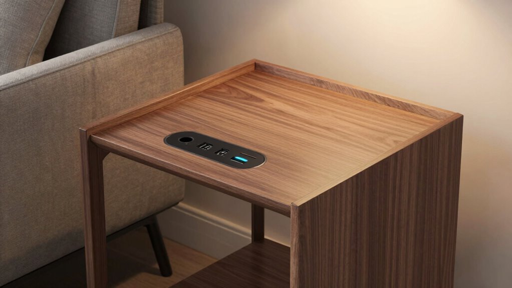 Did you know that fast-charging tech can deliver up to 50% battery boost in just 30 minutes? These side tables often support quick-charging technologies like USB-C Power Delivery or Quick Charge, but it varies by model. I recommend checking each table’s specifications to make certain of compatibility. Most modern designs are built to support fast-charging, so you can power up your devices swiftly and safely.