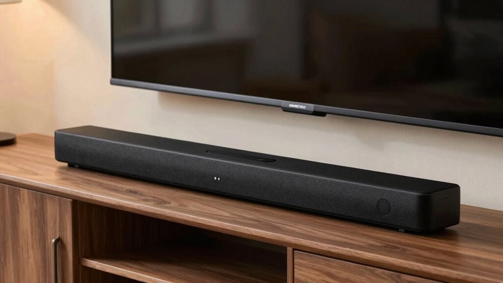 Achieving a balanced sound quality in a soundbar with a subwoofer is vital for an immersive listening experience. A well-balanced system delivers clear dialogue, detailed midrange, and rich bass without one overpowering the others. Look for a broad frequency response range, typically 45Hz to 20kHz, to guarantee full-spectrum sound across all audio elements. Using equalizer settings and sound modes can help tailor the sound to your preferences, whether emphasizing vocals or bass. The placement of the subwoofer also plays an important role; a proper position ensures even bass distribution without muddying higher frequencies. Ultimately, a soundbar with a harmonious balance between channels provides a richer, more engaging experience, avoiding the common pitfall of one element overshadowing the rest.