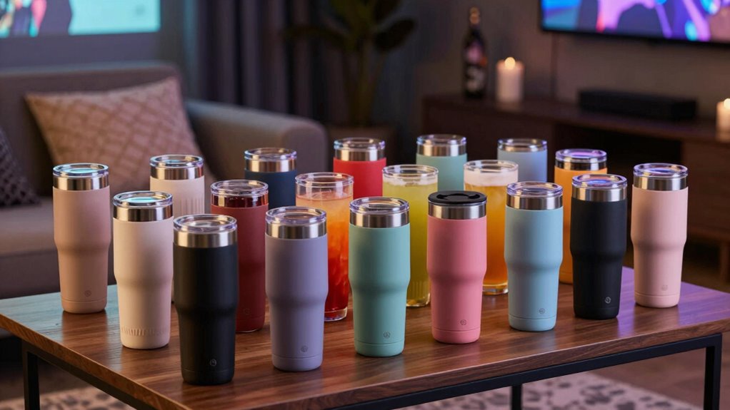 You’ll be pleased to know that spill-proof tumblers for movie night do keep drinks hot or cold for hours. I’ve tested several, and they maintain temperature surprisingly well, even during long movie marathons. The double-wall insulation is a game-changer, preventing heat transfer and condensation. So, whether you’re craving hot cocoa or icy soda, these tumblers guarantee your drink stays perfect throughout the movie.