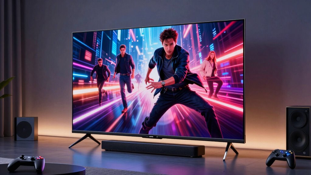 A high refresh rate is vital for delivering smooth motion during fast-paced gaming and dynamic movie scenes. I recommend a refresh rate of 120Hz or higher, as it considerably reduces motion blur and judder, making fast action clearer. Motion interpolation technologies like MEMC or Motion Rate further improve clarity by smoothing quick movements. Variable Refresh Rate (VRR) is also fundamental, as it minimizes screen tearing and input lag, creating seamless gameplay experiences. Additionally, Auto Low Latency Mode (ALLM) automatically switches the TV to low-latency settings during gaming, reducing input delay. A 60Hz refresh rate can cause noticeable blur and ghosting in rapid scenes, so higher rates are preferable for an ideal viewing experience. These features together ensure fluid, responsive visuals perfect for gaming and high-speed movies.